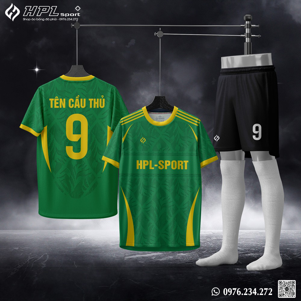 Bộ quần áo bóng đá độc quyền từ HPL Sport với sắc xanh lá trẻ trung, phối vàng nổi bật không chỉ mang đến diện mạo đậm chất thể thao mà còn đảm bảo sự thoải mái tối đa trong từng chuyển động.