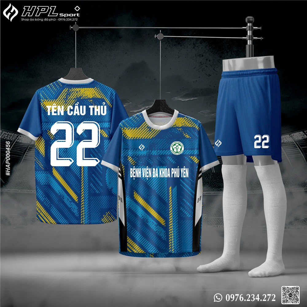 Sản phẩm áo bóng đá màu xanh navy kết hợp họa tiết vàng – trắng – đen, thiết kế hiện đại, chất liệu vải co giãn 4 chiều, thấm hút mồ hôi tốt, mang lại sự thoải mái, chuyên nghiệp và nổi bật cho người mặc.