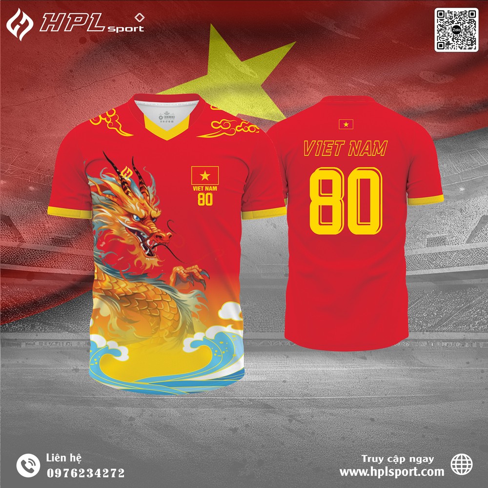 Với màu đỏ tươi mạnh mẽ cùng họa tiết rồng vàng uy nghiêm, áo thể thao HPL chủ đề Rồng Việt Nam là sự hòa quyện giữa tinh thần thể thao hiện đại và niềm tự hào dân tộc.