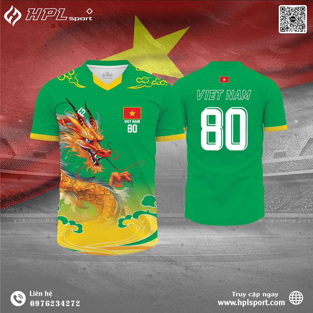 Áo thể thao màu xanh lục ấn tượng với họa tiết rồng vàng quyền uy và lá cờ Tổ quốc – khơi dậy tinh thần dân tộc, đậm chất thể thao, đầy cá tính.