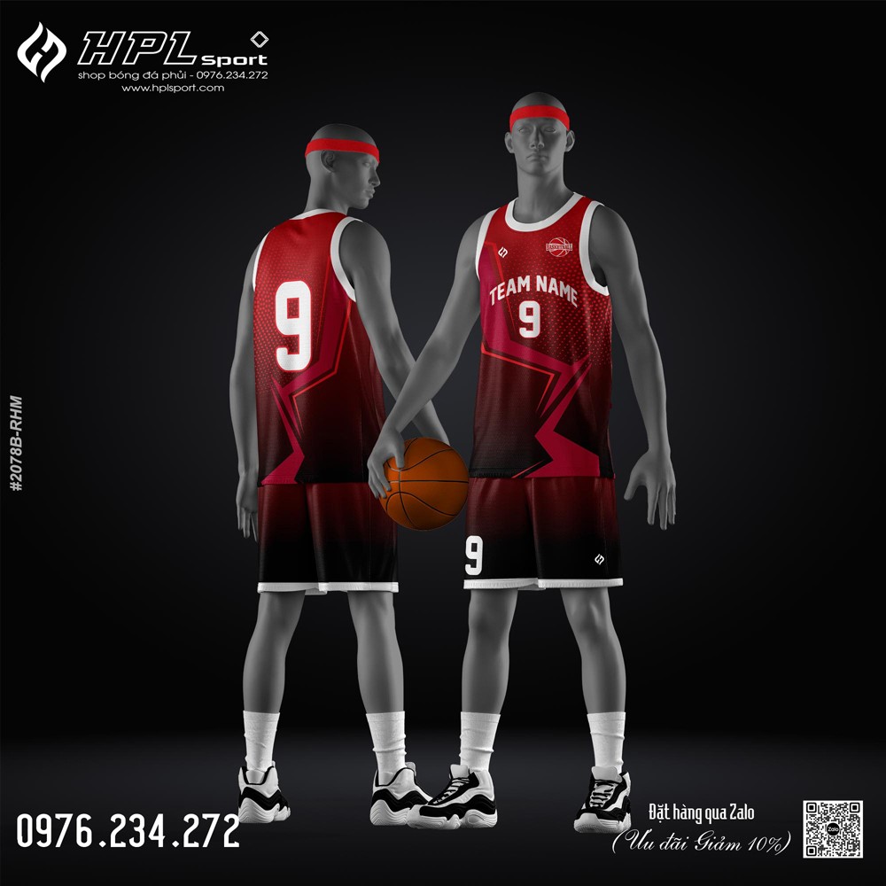 Bộ đồng phục bóng rổ đỏ – đen – trắng với thiết kế thủ công nghệ thuật, kết hợp hiệu ứng màu sắc gradient hiện đại cùng họa tiết ngôi sao cá tính, là lựa chọn tối ưu cho đội bóng chuyên nghiệp muốn thể hiện phong cách mạnh mẽ và đột phá.